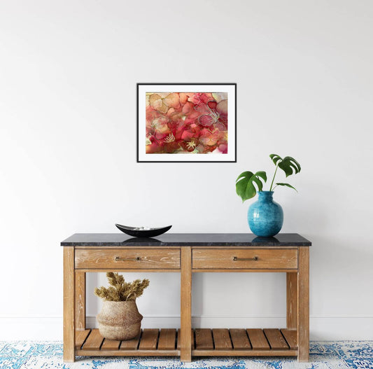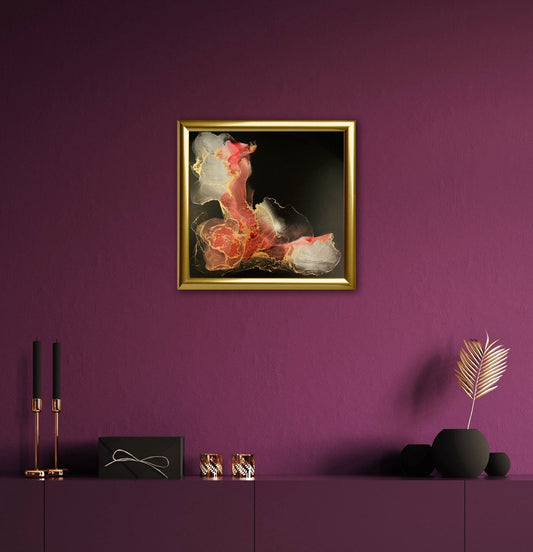 Golden Crimson Bloom, 2024. Handmade Original Ink Art Picture. Size A4: (21.0 x 29.7 cm) (8.3 x 11.7 inch).